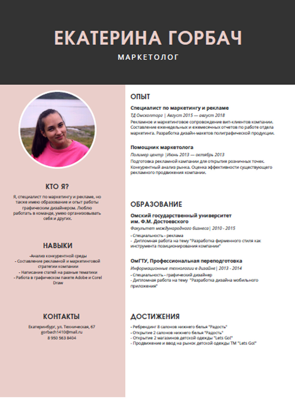 Я, Горбач Екатерина. Главной специальностью считаю маркетинг и рекламу, но также имею образование и опыт работы графическим дизайнером.